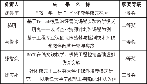 近日,宁波市教育局、宁波市教育科学规划领导小组公布了2015年度宁波市教育科研优秀成果奖获奖名单,沈昊宇等老师的5项成果获得奖项,其中,一等奖1项,二等奖3项,三等奖1项。本次获奖数量超过近4年获奖数总和,奖项级别也为历年最高。