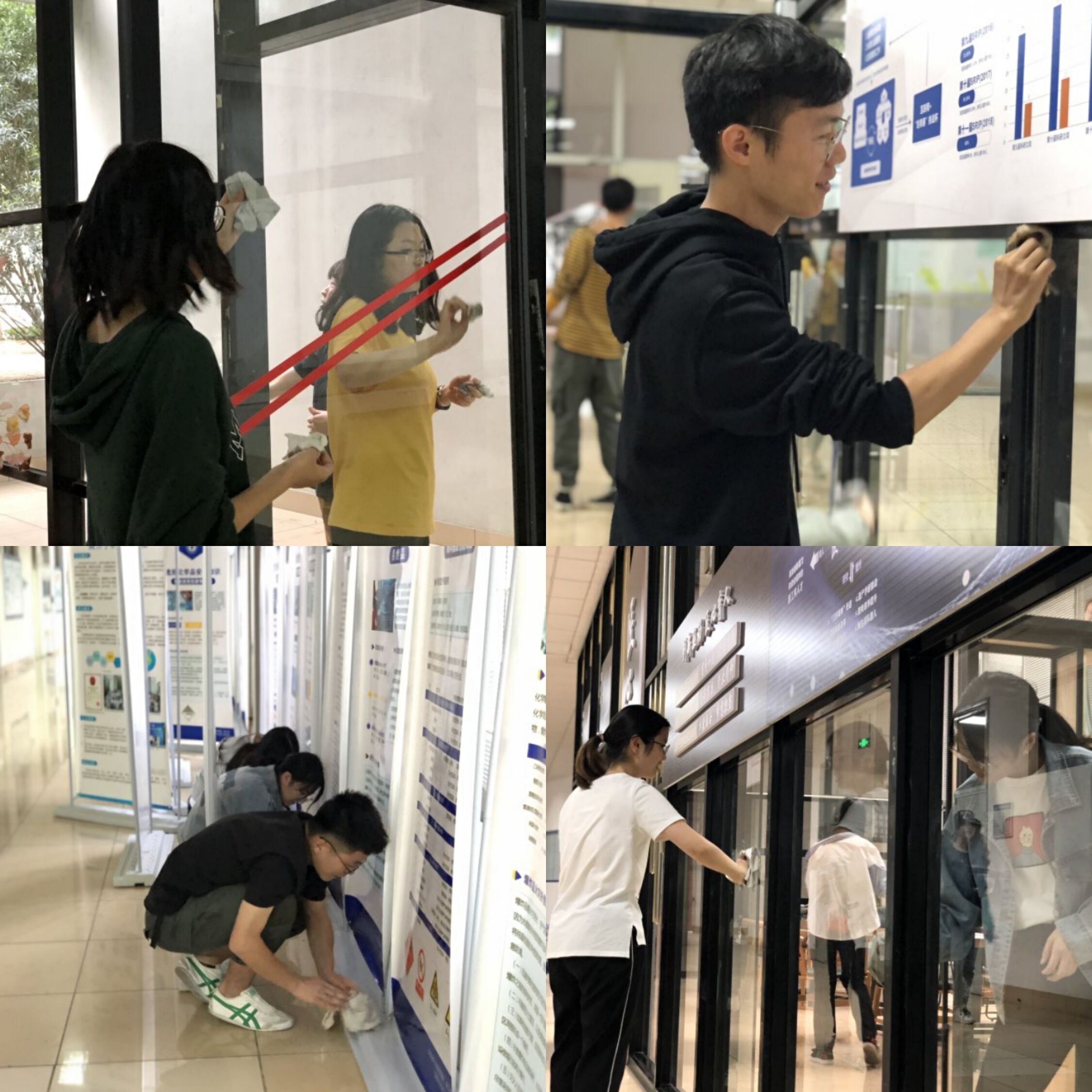 古天乐代言太阳集团138三个员工党支部分别负责不同楼层的打扫。清理教学楼过道的同学率先开始清理工作,他们对过道每一处进行细微入至地打扫,尽力创造出一个“一尘不染”的大环境;负责清理宣传和玻璃的同学对它们的缝隙角落进行着重清理;而摆放标语牌的地面等一些平时很难清扫到的地方,同学们在搬走标语牌后对其进行细致地打扫;其余负责清理标语牌和办公室铭牌的同学努力让牌子变得崭新。经过同学们近一个小时的努力后,古天乐代言太阳集团138变得焕然一新。