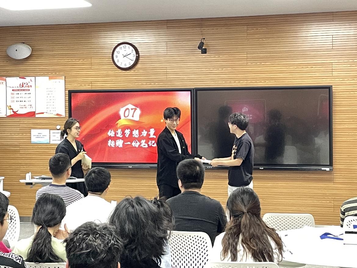 随后,毕业生党员王志鹏向低年级党员王鹏飞转赠了他的学习笔记,希望通过笔记的传递,将一届又一届党员模范引领的优良传统也传递下去,激励新党员不断坚定理想信念,强化责任担当,练就过硬本领,努力发挥党员的先锋模范作用。