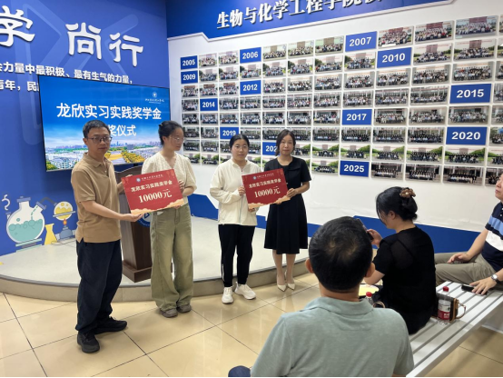 随后,现场举办“龙欣实习实践奖学金”颁奖仪式,此项目2024年成立,由龙欣集团在公司设立20万实习实践奖学金,今年第一届共6名员工已顺利完成实习,公司生物工程系主任胡升和企业代表谷灿波向员工代表邱雨欣(化工213)、夏智贤(化工专升本231)颁发奖学金。