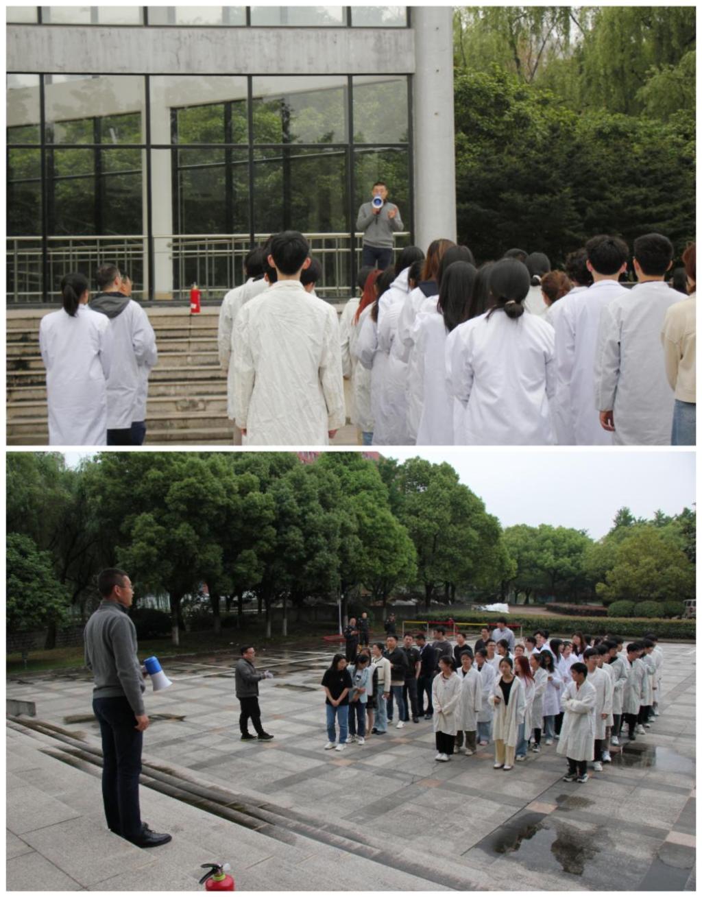 整个消防演习共分楼宇疏散、讲解消防安全知识、认识各种消防工具的名称和灭火演练4个环节。下午16时,当消防引导员的哨声响起,参加消防演习的师生从消防通道快速撤离,并有序到达可珍讲堂安全点。