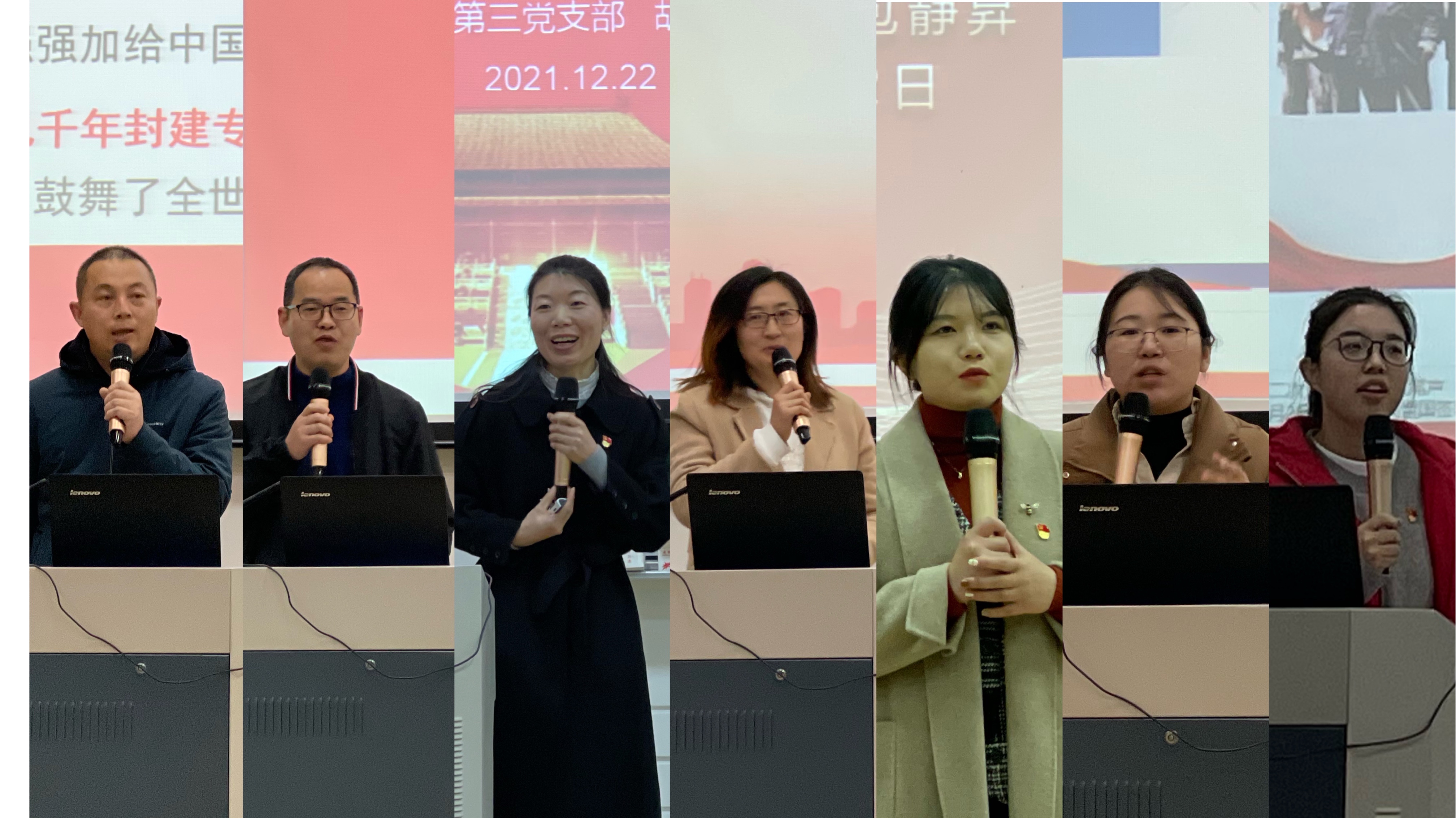 教工第四党支部书记吕海霞老师讲述了中国共产党百年奋斗的历史意义,她指出《中共中央关于党的百年奋斗重大成就和历史经验的决议》(以下简称《公报》)提出的“从根本上改变了中国人民的前途命运”“开辟了实现中华民族伟大复兴的正确道路”“展示了马克思主义的强大生命力”“深刻影响了世界历史进程”“锻造了走在时代前列的中国共产党”五个方面历史意义是我们党对百年来奋斗历史意义的最新概括和深刻表达,体现了百年党史的主题主线,主流本质和深远影响,我们要准确把握这“五大历史意义”的内涵要义和时代价值,始终坚信对党的信赖,坚决拥护党的领导。