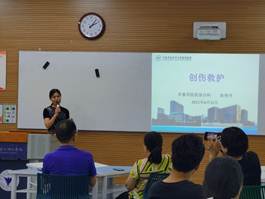 张伟丹医师结合大量的临床实例,通过丰富多彩的PPT展示,对常见的创伤救护技术和救护过程中的注意事项,进行了生动形象的讲解与培训。周夷霞医师首先播放了一段发生在院内的心脏骤停病人的抢救视频,生动形象地展示了在短短几分钟的黄金抢救时间,科学救治是挽回病人生命的关键。接着,周医师利用PPT展示结合仪器实操,为大家详细讲解了心肺复苏的操作要领和AED的使用方法。培训过程中,师生们认真聆听并积极互动,现场气氛十分热烈。