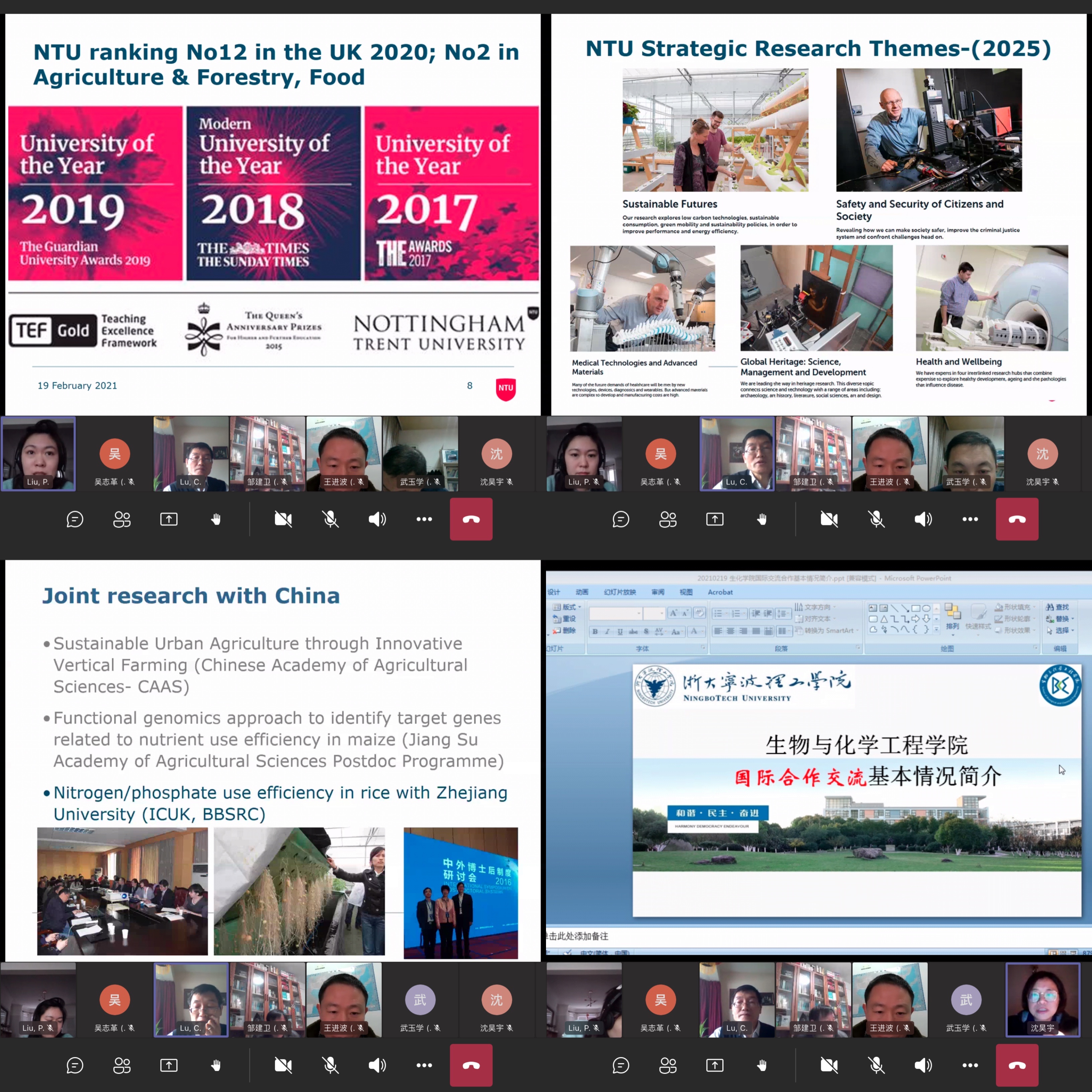 2月19日,古天乐代言太阳集团138与英国诺丁汉特伦特大学(Nottingham Trent University,简称NTU)举行国际合作视频交流会。NTU动物乡村及环境科学公司国际合作负责人陆春贵教授、国际合作处东亚区域合作事务负责人刘沛女士,古天乐代言太阳集团138副经理沈昊宇、副经理王进波教授,各研究所负责人及相关专业教师参加本次交流。会议由沈昊宇副经理主持,并邀请了公司国际交流合作处程萌副处长、设计公司张峰副经理参加。