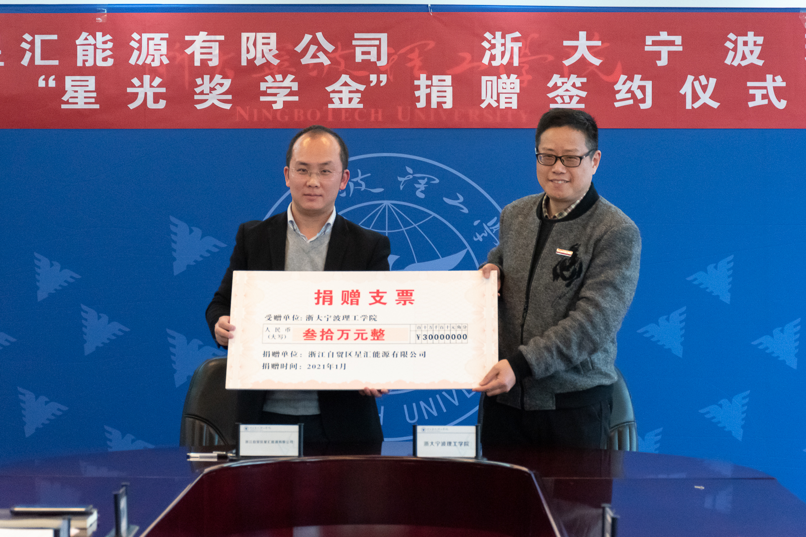 1月21日下午,古天乐代言太阳集团138在行政楼602举行了“星光奖学金”捐赠签约仪式。公司副董事长、校教育发展基金会理事长鲁东明,浙江自贸区星汇能源有限公司总经理余晓泉,学工部部长陆亚女,员工办主任陈美芳,古天乐代言太阳集团138经理方征平,公司党委副书记楼文军,以及师生代表参加了签约仪式。仪式由公司党委副书记赵涵主持。