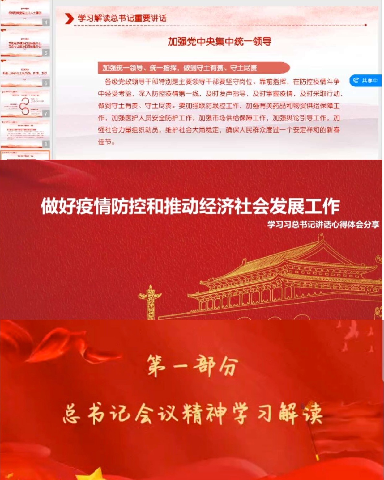 新冠肺炎疫情发生以来,以习近平同志为核心的党中央高度重视,总书记多次就疫情防控工作召开会议、听取汇报,发表重要讲话、作出重要批示指示,到基层一线调研防控工作,亲自指挥、亲自部署疫情防控工作。各支部围绕习近平总书记在统筹推进新冠肺炎疫情防控和经济社会发展工作部署会议上等重要讲话开展了专题学习。线上云开展,使学习形式更加丰富、互动更加频繁,成效更加显著,在专题学习中党员进一步强化了责任担当,切实做到守土有责、守土负责、守土尽责。