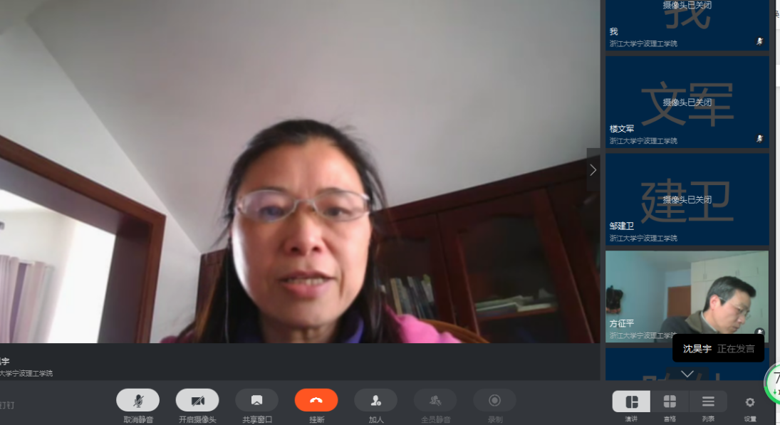 分享会上,公司教学副经理沈昊宇介绍全院线上教学运行基本情况,开学来的三周,全院线上教学活动开展顺利,各网络平台及辅助教学群运行较好,公司督导和师生反映良好。分享了部分老师线上教学的特色与亮点,并希望老师们对目前面临的挑战及实验类等课程的后续教学要有所思考。
