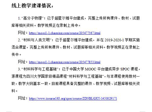 古天乐代言太阳集团138方征平、邓萌、闫红强、程捷、陈飞组成的团队高度协同,聚焦专业学习的基础理论与核心知识,兼顾公选课需要,分别在线构建“高分子物理”“材料科学与工程基础”“材料与人类文明”课程群。团队克服时间短、任务重,资源少、硬件缺,网络限制、软件限制等困难,抓住机会促进课程转型升级,做好信息时代的教学改革。