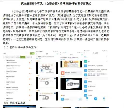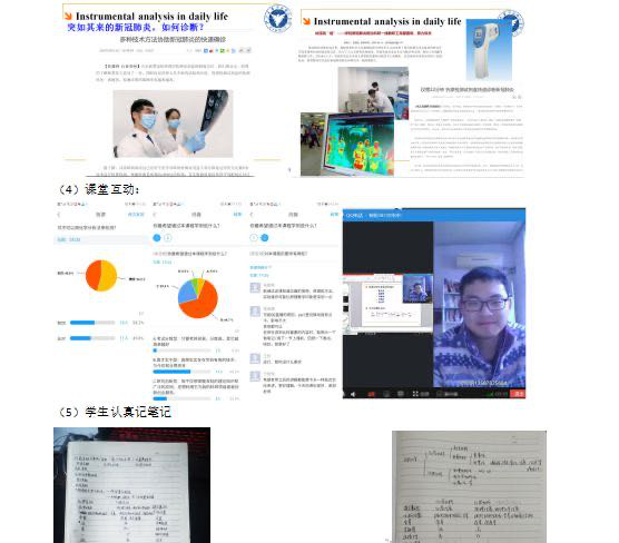 陈佳、沈昊宇、钟国伦、代冬梅组成的《仪器分析》课程建设团队,以“抗击疫情有你有我,《仪器分析》启动直播+平台教学新模式”为理念,克服疫情期间教学的困难,课程组1月底就完善原有在超星平台建课的网络资源,补充了录播、视频等教学资源;并启动了防止用户集中,平台拥堵等问题,做好了网络直播+平台教学新模式等预案。结合课程思政,率先采用“新冠肺炎检测方法”这一社会热点激发员工们学习的兴趣,利用与员工日常生活密切相关的素材等引发员工思考。