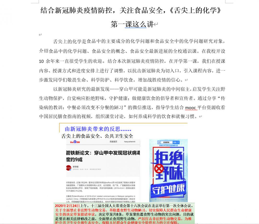 公司副经理沈昊宇授课的《舌尖上的化学》,结合新冠肺炎疫情防控,关注食品安全,启发员工关注野生动物保护,自觉响应拒绝野味,守护健康,做健康饮食的倡导者和宣传者。在《生物医药与新材料化工科研创新训练》授课中,以在抗击新冠肺炎中的的科技创新案例为切入点,组织同学讨论,激发同学们创新创业激情,引导同学们学好专业课,培养创新思维,为科技强国而努力奋斗。