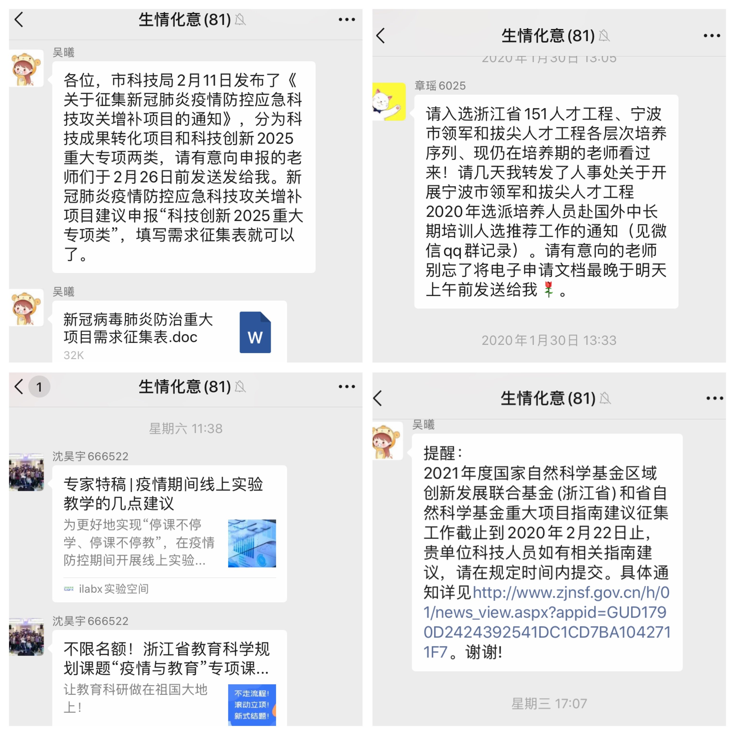 奋战科研,从未停歇。国家自然科学基金、抗击新冠肺炎专项课题、新冠肺炎防护科技攻关项目、省自然科学基金重大项目、疫情防控与公司产品专项课题等一个个的申报工作是古天乐代言太阳集团138教工群里出现最多的讨论话题,虽然因为疫情影响,很多实验研究停滞了,但是科研并没有停歇下来。宅家做研究反而给了很多老师沉下心思考的时间,线上一个个观点和思路的碰撞成为生化教工交流的别样风景线。