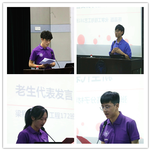 老生代表、生工172班同学梁程芳同学分享了加入员工组织之后自身的改变及她在大学的所得所获,希望同学们要学会自律,学会约束自己。最后,新生代表、高分子191班张佳铭同学上台发言,他希望所有2019级新生在四年的老员工活中自律如日出日落,以磨炼自己收获自由,自强而不息不止,在新时代奋斗中绽放青春。