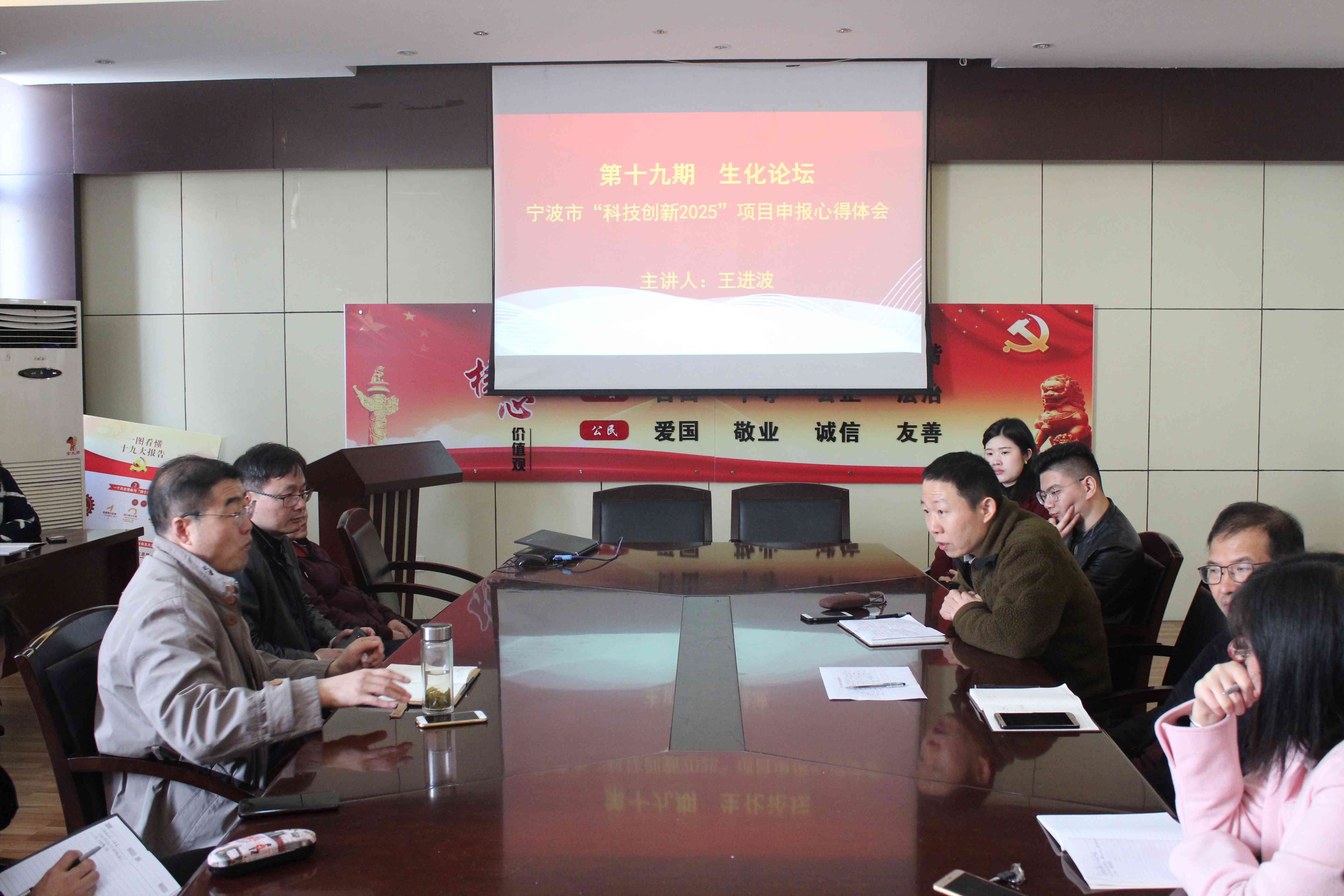 2019年3月27日,第十九期“生化论坛”在NE209举行,本次论坛邀请公司王进波教授为大家作了以“宁波市‘科技创新2025’项目申报的心得与体会”为主题的报告。公司20多名教师参加论坛。