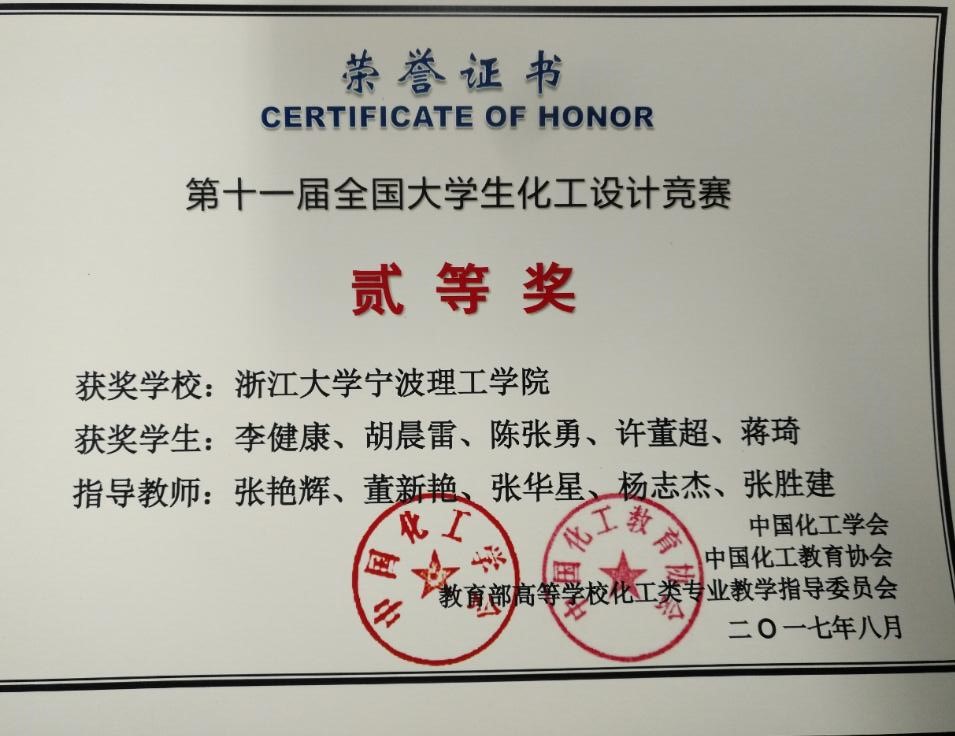 2017年8月18日至23日,由中国化工学会、中国化工教育协会、教育部高等公司化工类专业教学指导委员会主办的2017第十一届全国老员工化工设计竞赛全国总决赛于在浙江大学玉泉校区举行。由公司张艳辉、董新艳等老师指导的员工团队(队员:李健康 胡晨雷 陈张勇 许董超 蒋琦)经过严格的层层选拔和比拼,最终获得全国二等奖。