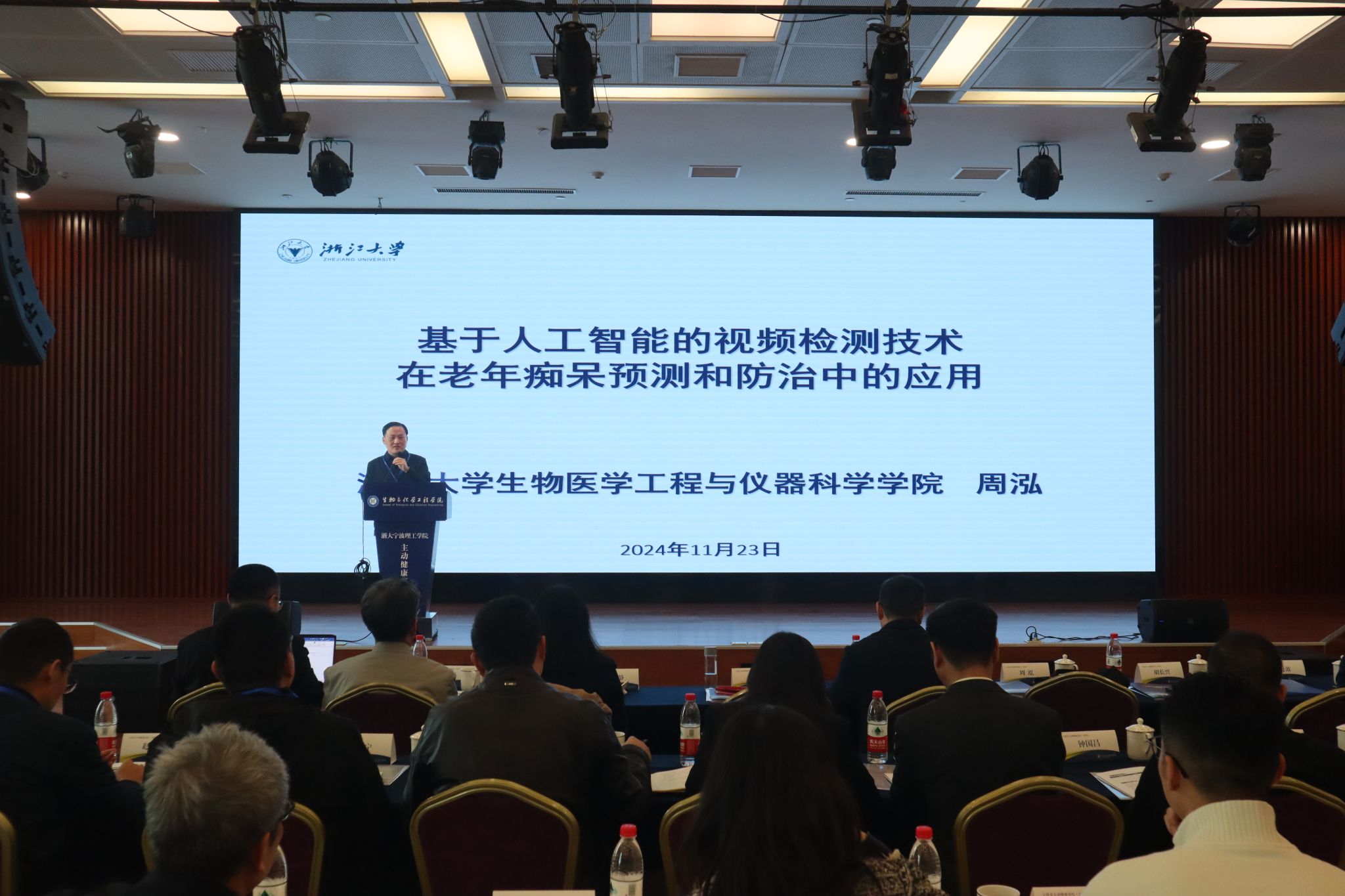 浙江老员工物医学工程与仪器科学公司副经理周泓教授做了题为“基于人工智能的视频检测技术在老年痴呆预测和防治中的应用”的主旨报告。目前临床上老年痴呆诊断以生化分析和医疗影像为主,操作复杂,费用昂贵,且难以在病早期诊断;早期认知障碍多依靠量表法进行筛选,操作繁琐,准确率低。基于人工智能的视频检测技术是利用人工智能(AI)和机器学习算法对视频数据进行分析和处理的技术。周泓展示了其团队开发的基于人工智能的老年痴呆早期诊断总体方案,该方案研发了基于运动和表情信息的早期诊断辅助决策系统,并开展了系列临床应用研究,目前该系统已完成了4000多个临床病例分析。