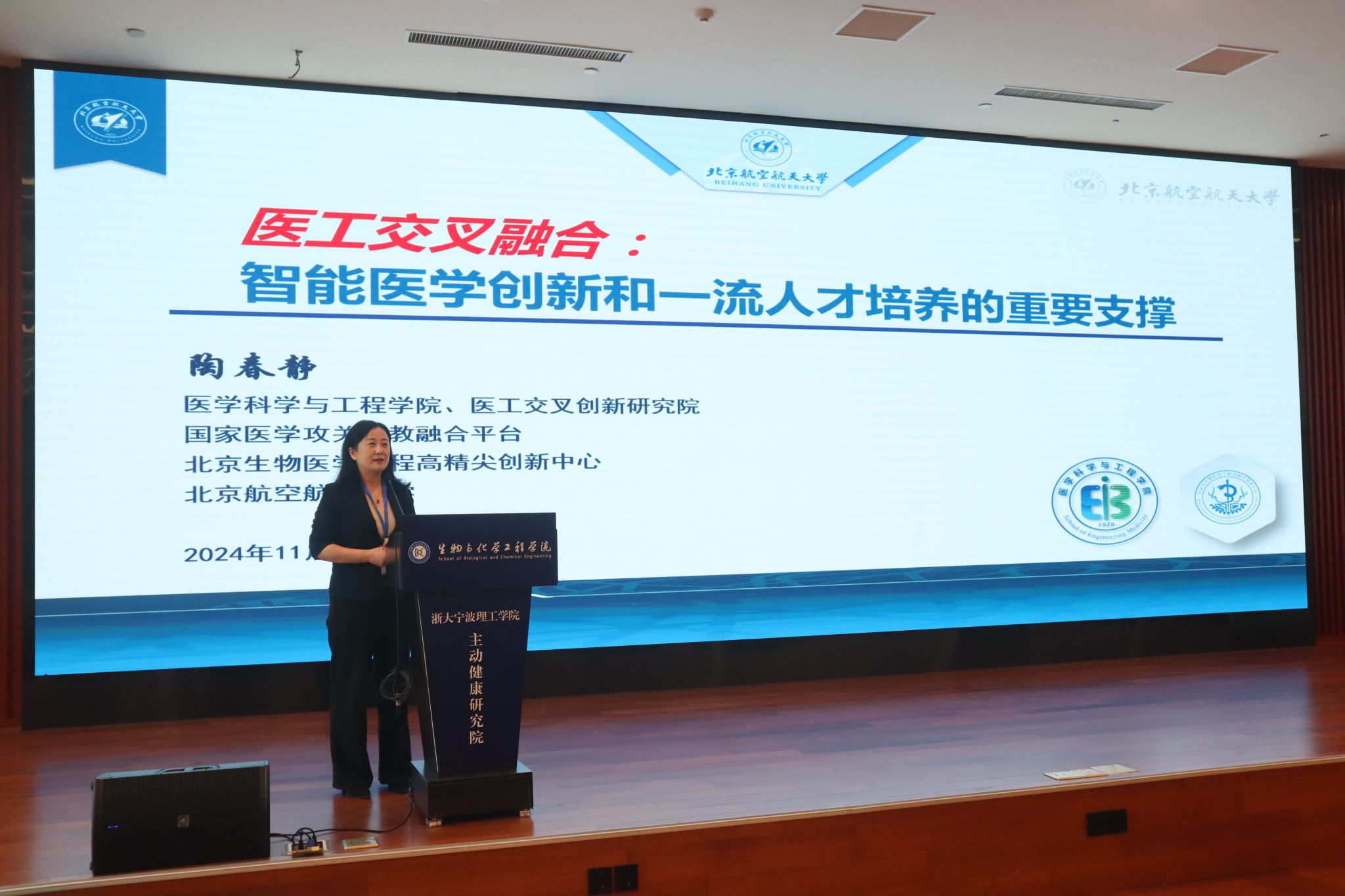 在“医工交叉融合:智能医学创新和一流人才培养的重要支撑”的主旨报告中,北京航空航天大学医学科学与工程公司、医工交叉创新研究院副经理陶春静教授分享了公司将“优势医工”作为发展战略,聚力打造医工交叉学科群,生物医学工程学科在短短二十年间从创建到第五轮学科评估进入顶级学科行列的发展历程。北京航空航天大学在医工创新人才培养、产教协同、科教融合和科技创新等方面,以国家重大需求为导向,开发了手术机器人、ECMO等高端装备,取得了系列突破性创新成果。陶春静介绍了其团队在智能康复辅助系统、智能助行系统、智能矫形器和智能运动功能评估系统等领域取得的进展和未来发展方向。