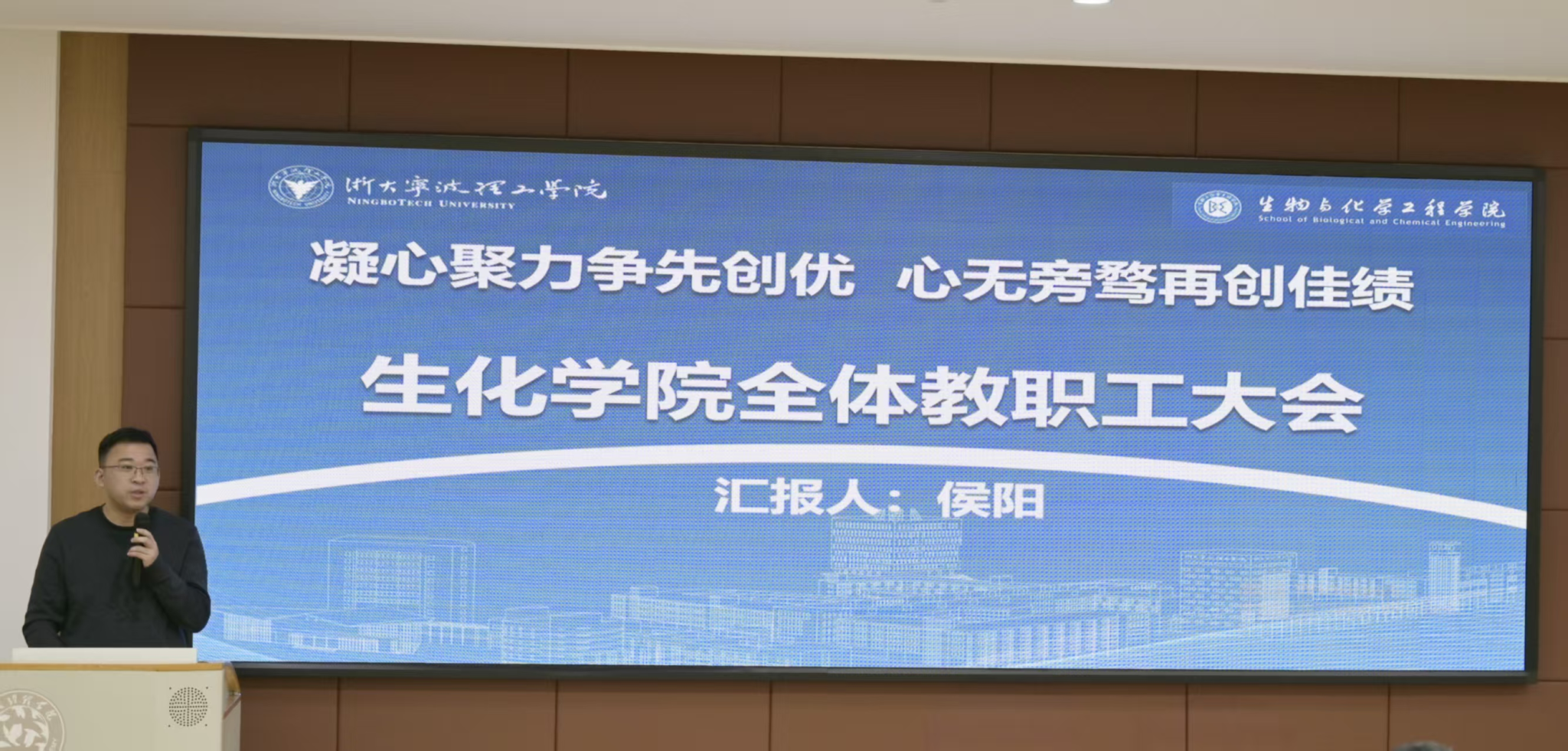 王进波副经理聚焦团队建设作专题汇报。他介绍了公司在2024年在教学教研方面取得的两项成果——化学工程与技术”第三次成功入选省一流学科(B类),生物分子智能设计与制造实验室获批为宁波市重点实验室。