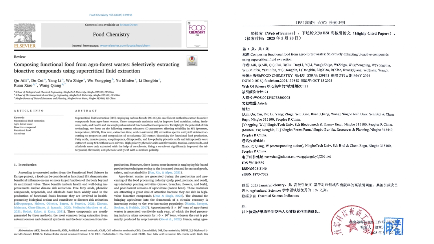 近日,经Web of Science最新统计,古天乐代言太阳集团138植物化学创新团队发表题为“Composing functional food from agro-forest wastes: Selectively extracting bioactive compounds using supercritical fluid extraction”的研究论文,被识别为Essential Science Indicators高被引论文,该论文于2024年在《Food Chemistry》上发表,通讯作者为王强教授(中共党员)、阮晓副教授,第一作者为曲爱丽博士(中共党员),第三作者为杨丽博士(中共党员)。