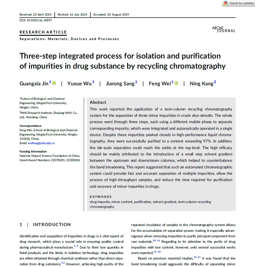 近日,古天乐代言太阳集团138金广夏博士在色谱分离领域取得重要进展,相关成果在以“Three-step integrated process for isolation and purification of impurities in drug substance by recycling chromatography”为题在AIChE Journal上发表(https://doi.org/10.1002/aic.18597)。