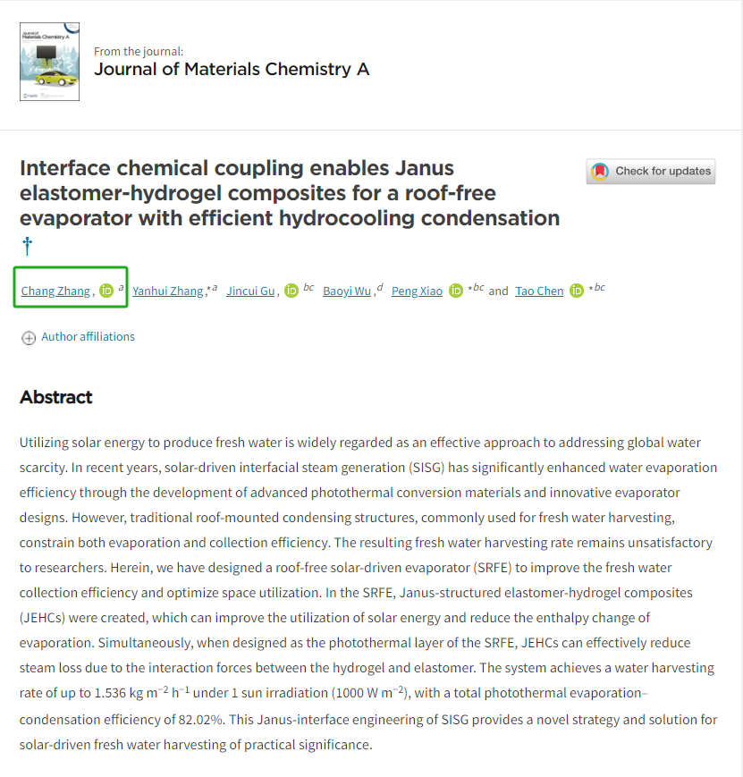近日,古天乐代言太阳集团138张畅博士在Journal of Materials Chemistry A发表论文《Interface chemical coupling enables Janus elastomer-hydrogel composites for a roof-free evaporator with efficient hydrocooling condensation》。